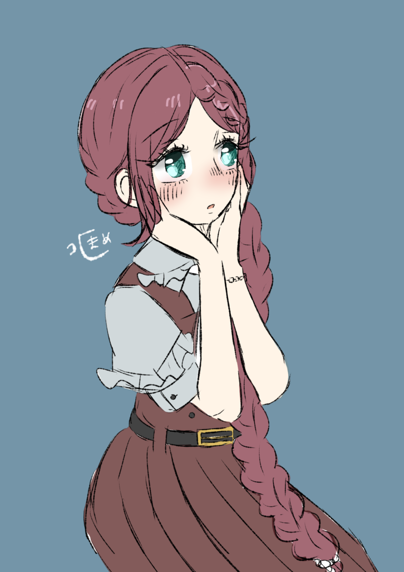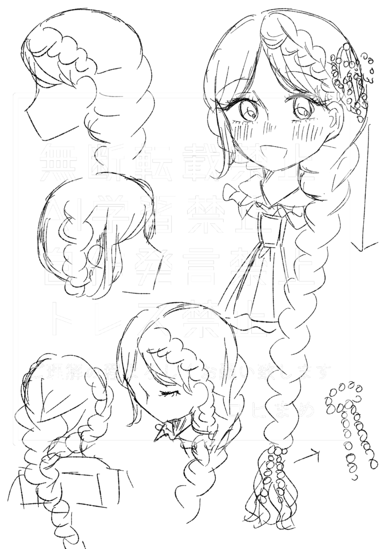 稟湖の三つ編みは結構複雑な作りになっているので、今後誰かに稟湖を描いていただく際の参考になればと作成中です。三つ編みは全部で三つあって、全て最後は合流するというヘアスタイルとなっております。